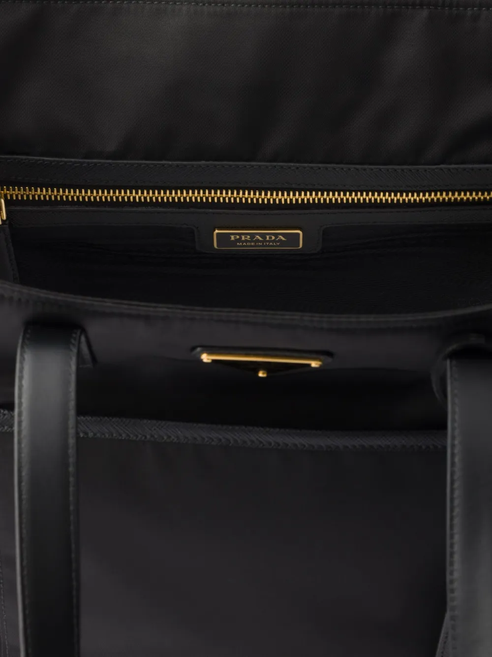 Il design essenziale è valorizzato dal triangolo in smalto con logo, simbolo riconoscibile del brand, e dal ciondolo portachiavi che aggiunge un dettaglio pratico e stiloso. I due manici piatti garantiscono una presa comoda, rendendola perfetta per l’utilizzo quotidiano.